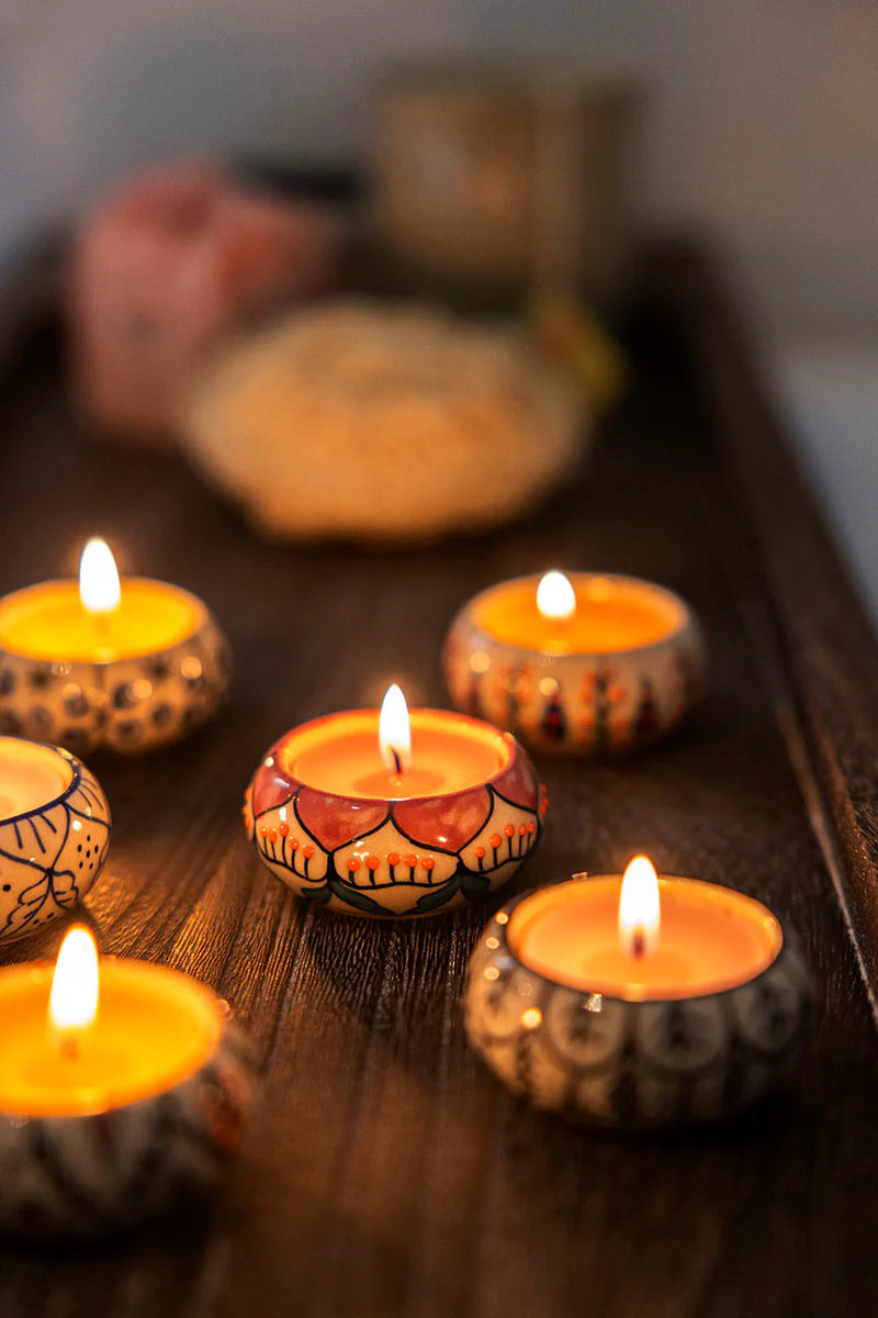 Naš držač za čajne svijeće TALA GLOW ručno je oslikan i osvaja svojim razigranim, šarenim uzorkom. Topla svjetlost svijeće ogleda se u finim detaljima, stvarajući ugodnu, privlačnu atmosferu.