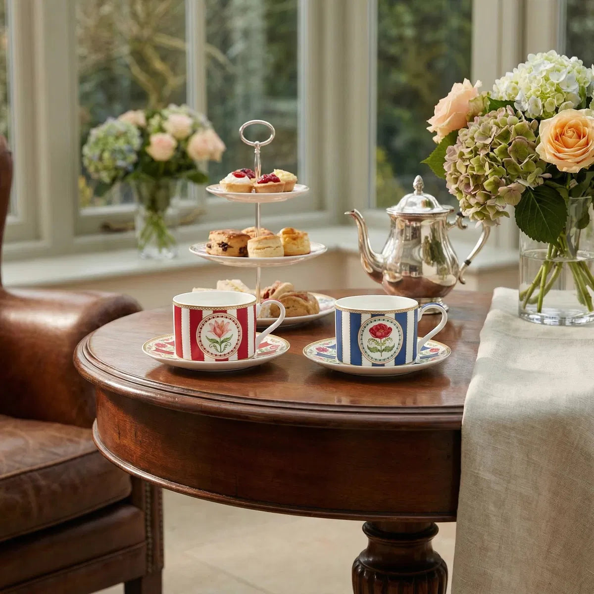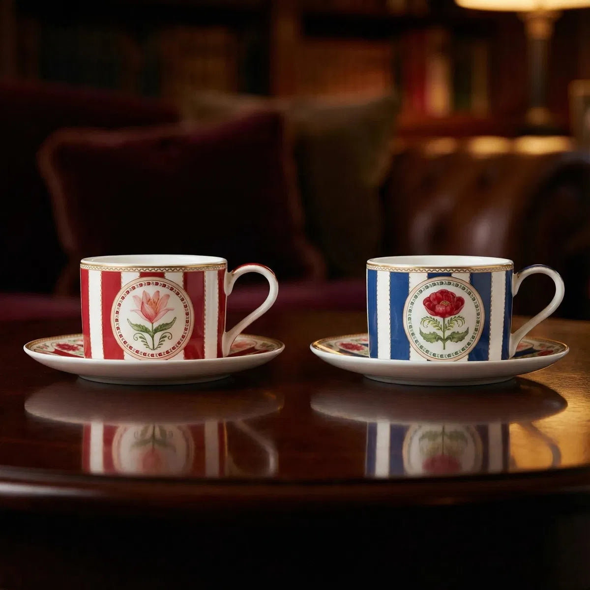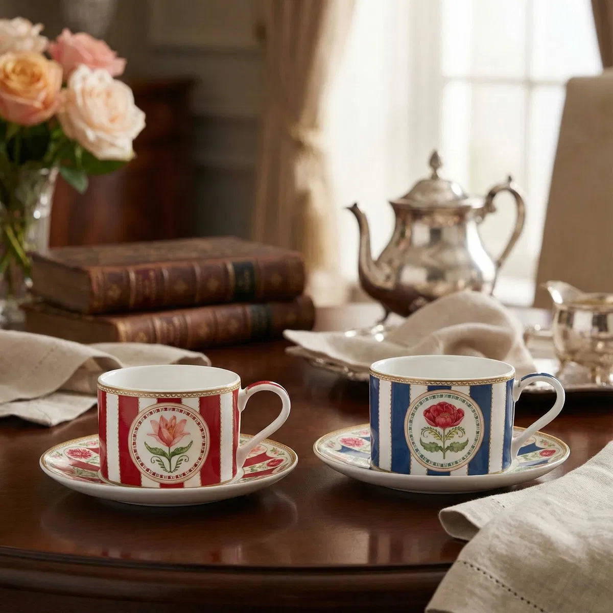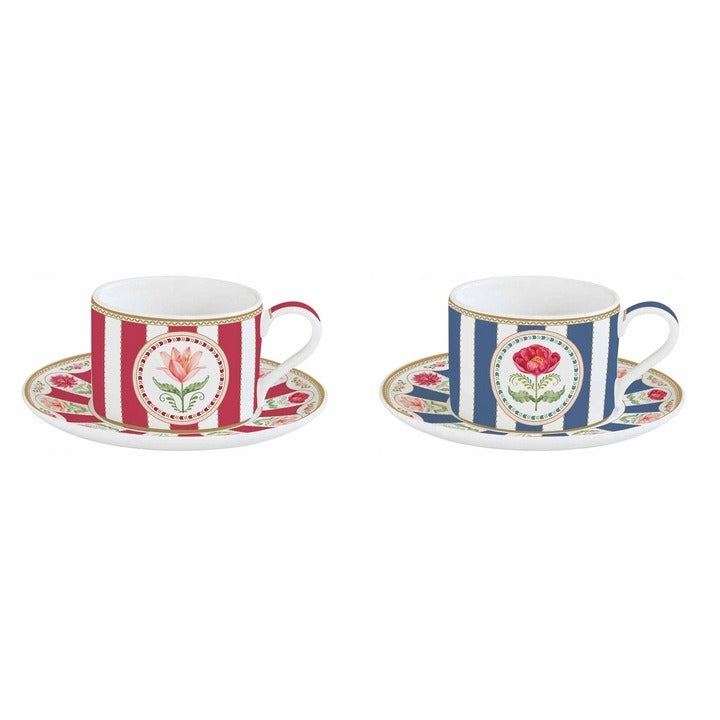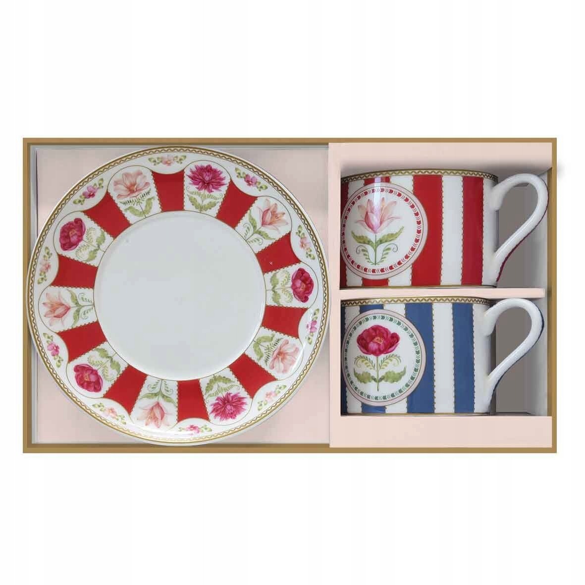 Uključuje: Set od 2 šolje i tanjirića, cvjetni dizajn, bijela, crvena, plava, kapacitet 240ml, porculan, u poklon kutiji