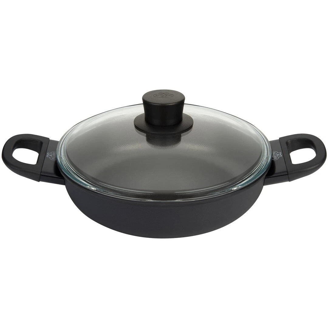Duboka Avola tava promjera 24 cm s poklopcem talijanske marke Ballarini izvrsna je kombinacija vrhunske kvalitete i svestranosti. Posuđe iz ove serije ima lagano tijelo obloženo izvrsnim neprijanjajućim premazom, što vam omogućava kuhanje vaših omiljenih jela s minimalnom količinom ulja. Četveroslojni titan KERAVIS Extreme premaz nanesen na aluminijsko tijelo tave ojačan je keramičkim česticama, što pruža iznimnu otpornost na mehanička oštećenja. Osim toga, tava se može sigurno prati u perilici posuđa. Dno Avola tave izrađeno je od višeslojnog, kovanog aluminija koji je siguran za hranu, u kombinaciji s visokokvalitetnim nehrđajućim čelikom. Ovaj dizajn čini svo posuđe iz ove serije prikladnim za sve vrste ploča za kuhanje, uključujući indukcijske štednjake. Višeslojno dno posuđa također učinkovito apsorbuje toplotu, čineći kuhanje vaših omiljenih jela učinkovitijim i energetski štedljivijim. Vrijedi spomenuti ergonomske ručke od crne plastike koje ostaju hladne tokom upotrebe, što omogućuje sigurno rukovanje tavom bez rizika od opekotina. Visokokvalitetni neprianjajući titan KERAVIS Extreme premaz s unutarnje i vanjske strane posuđa omogućava kuhanje s minimalnom dodanom masnoćom i olakšava čišćenje. Sigurno za zdravlje i okoliš – ne sadrži PFOA, spojeve nikla ni teške metale. Posuđe iz serije Avola može se prati u perilici posuđa. Ručke su izrađene od crne plastike. Uključen je stakleni poklopac.