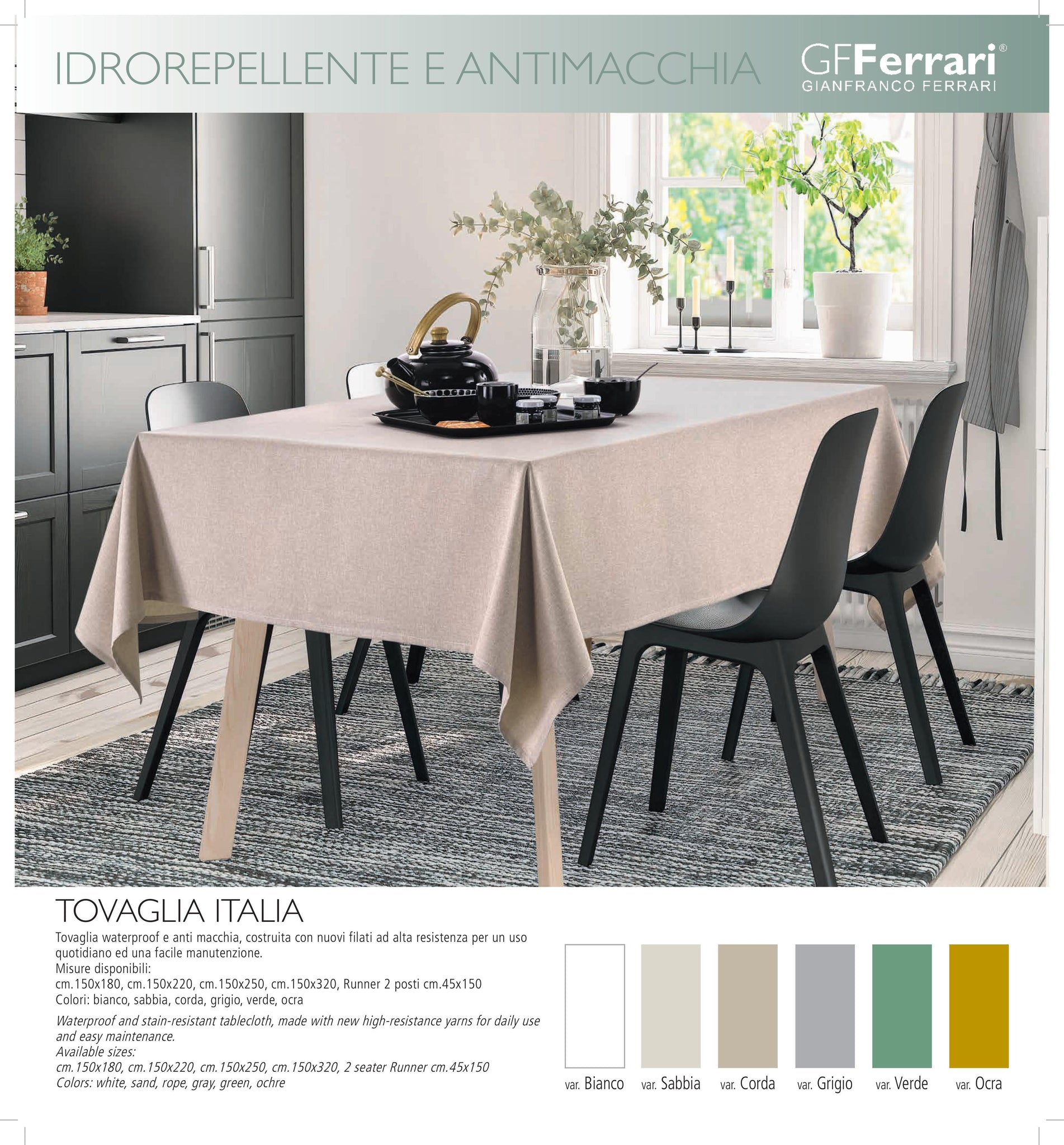 Vodootporan i na mrlje otporan stolnjak, izrađen od novih visokočvrstih prediva za svakodnevnu upotrebu i jednostavno održavanje.